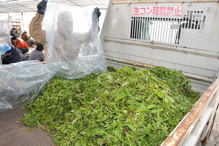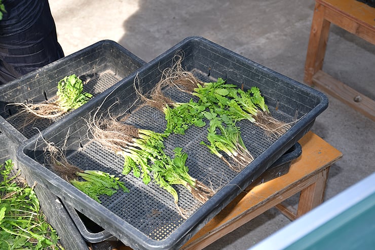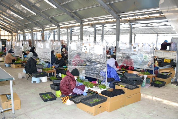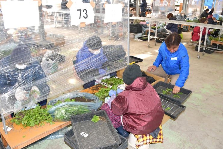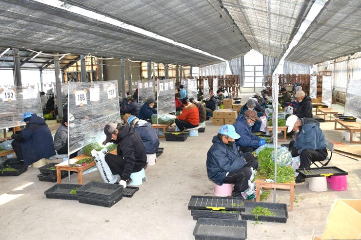 畑で丁寧に育てたなずなを収穫したあとは、出荷に向けて仕分け作業を行います。
