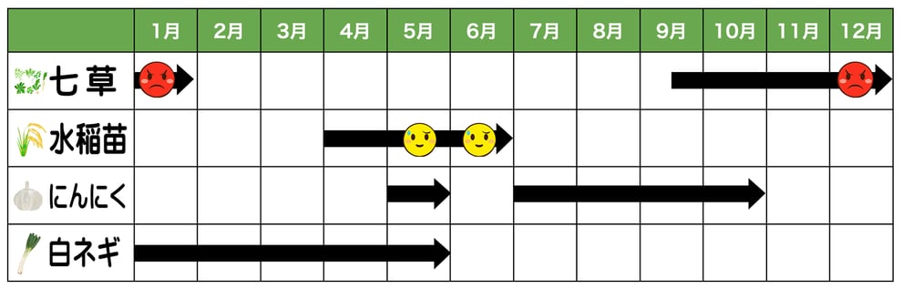 | 七草 | 9月末〜10月末 | 12月末〜1月初 | 12月末〜1月初 |